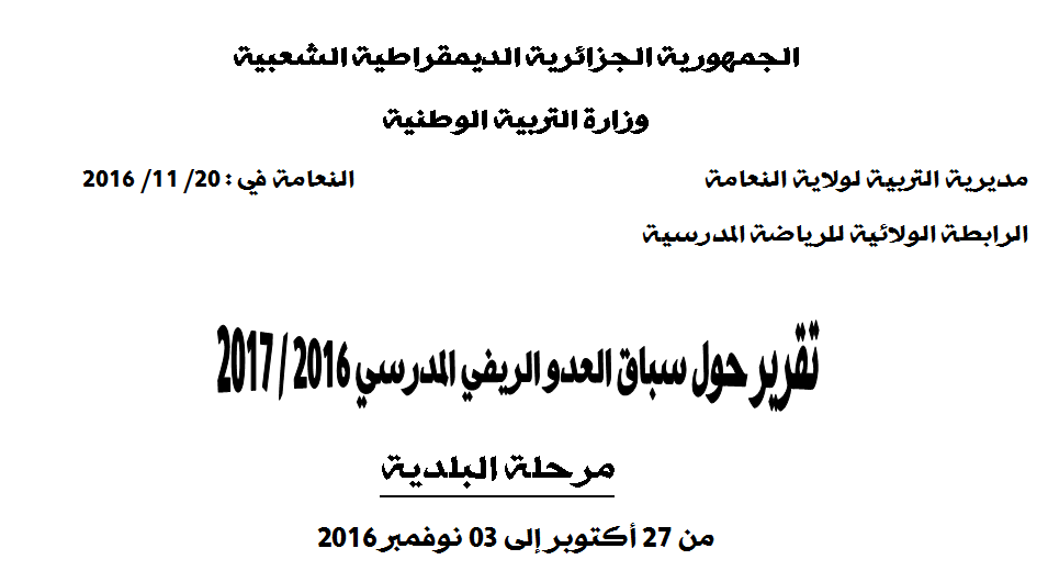 مرحلة البلدية من 27 أكتوبر إلى 03 نوفمبر 2016 في إطار البرنامج المسطر من طرف الاتحادية الجزائرية للرياضة المدرسية…