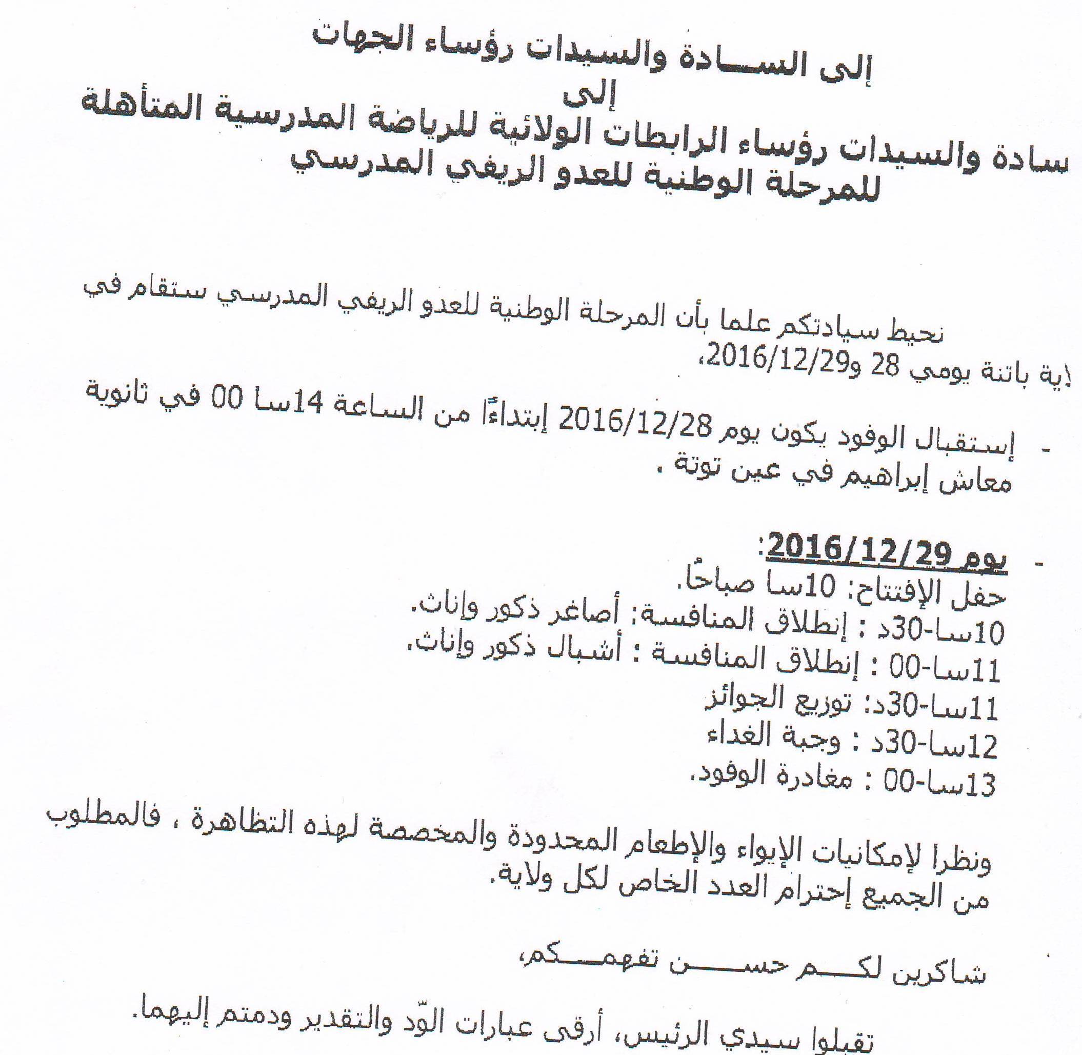 القائمة الإسمية للمتأهلين للبطولة الوطنية المدرسية للعدو الريفي 2017/2016