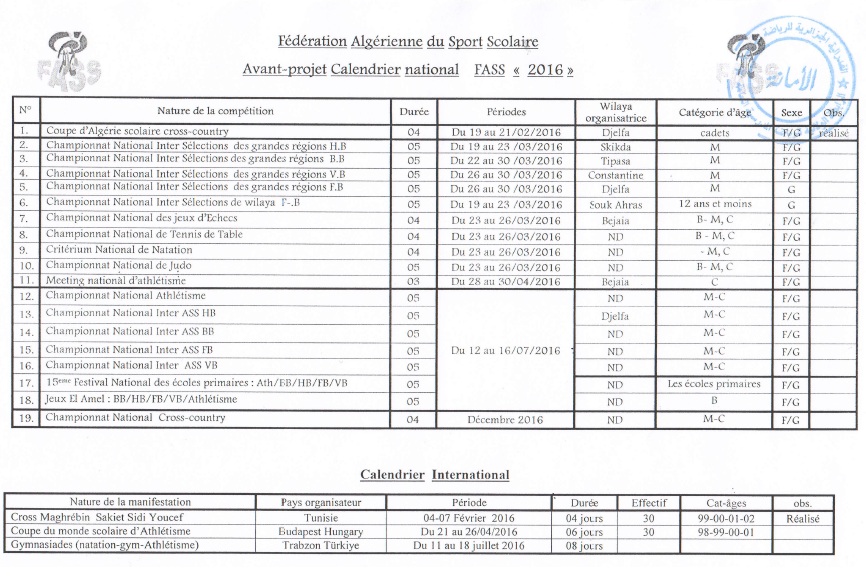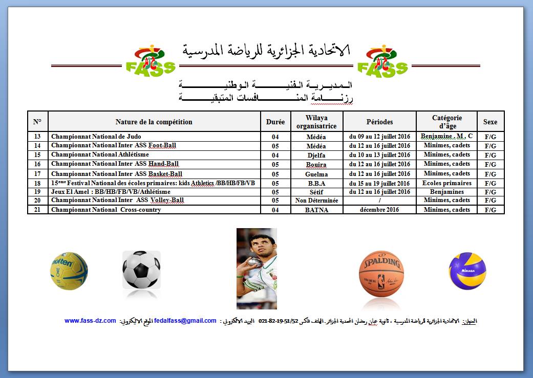 رزنامة المنافسات الوطنية المتبقية المدرسية للموسم 2016/2015