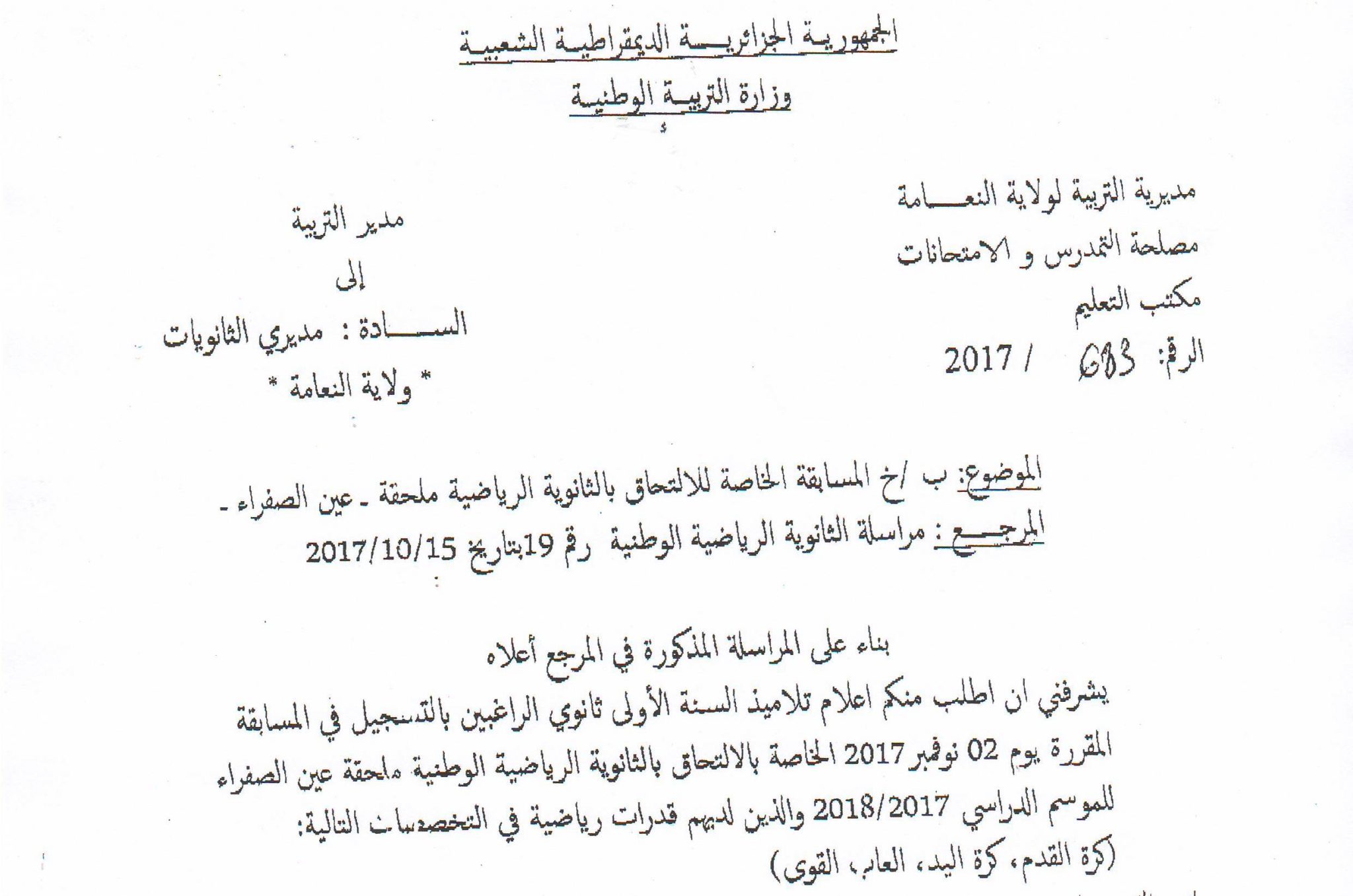 الجمهورية الجزائرية الديمقراطية الشعبية وزارة التربية الوطنية مديـرية التربية لولايـة النعامة الرابطة الولائية للرياضة المدرسية الرقـم 109/ر.و.ر.م/2017. رئيس الرابطـــة…