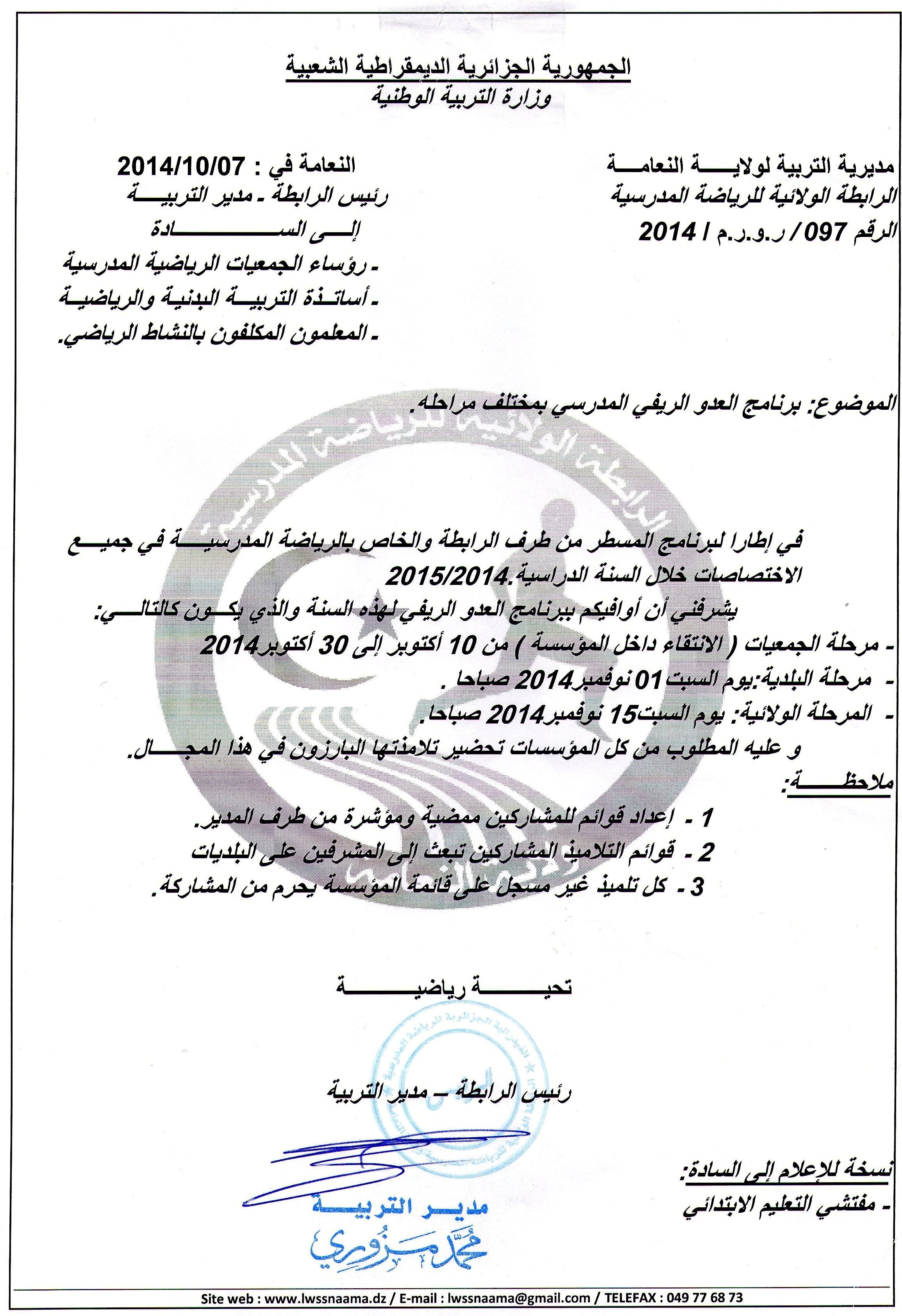 يشرفني أن أوافيكم ببرنامج العدو الريفي لهذه السنة والذي يكـــون كالتالــــي: