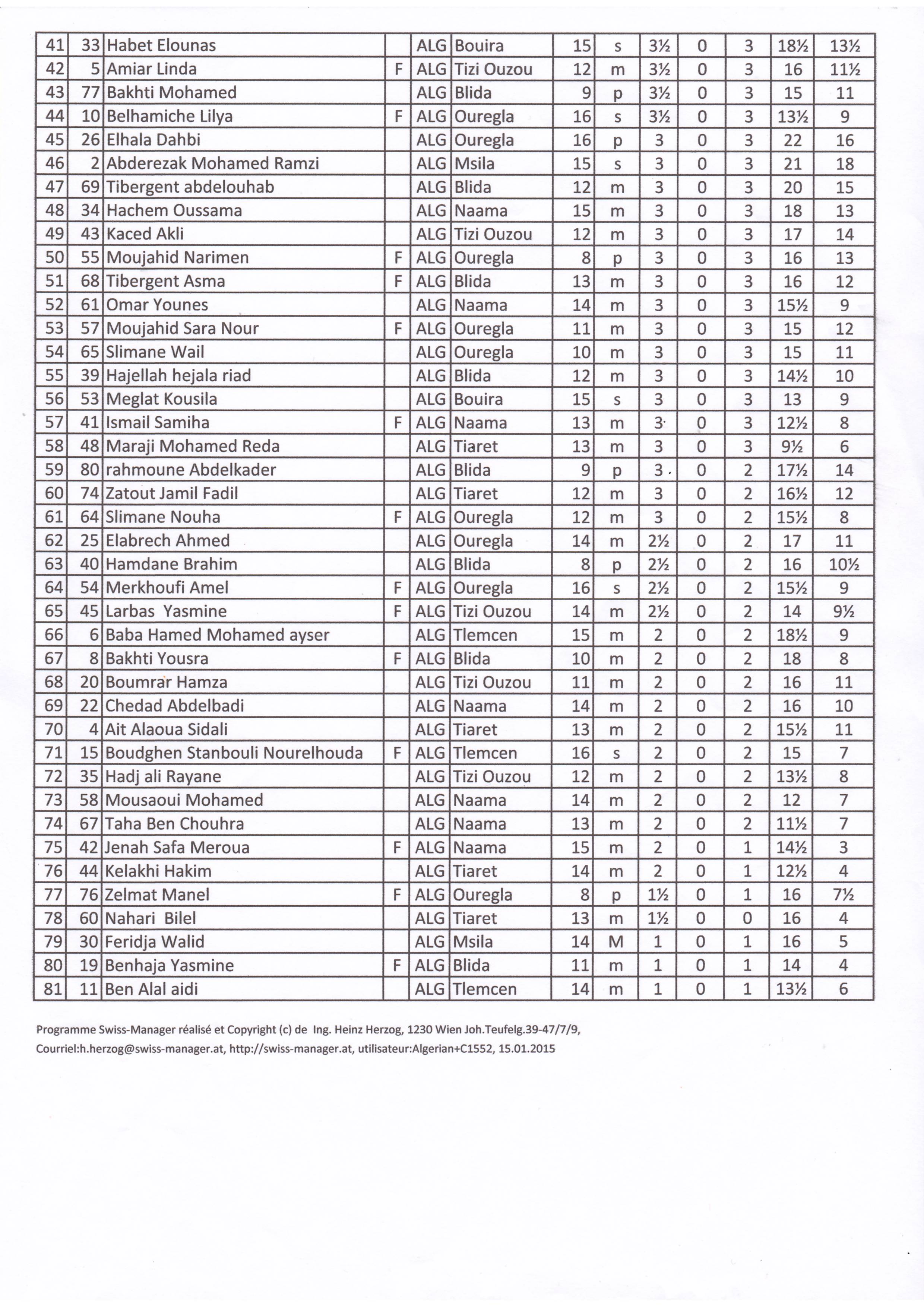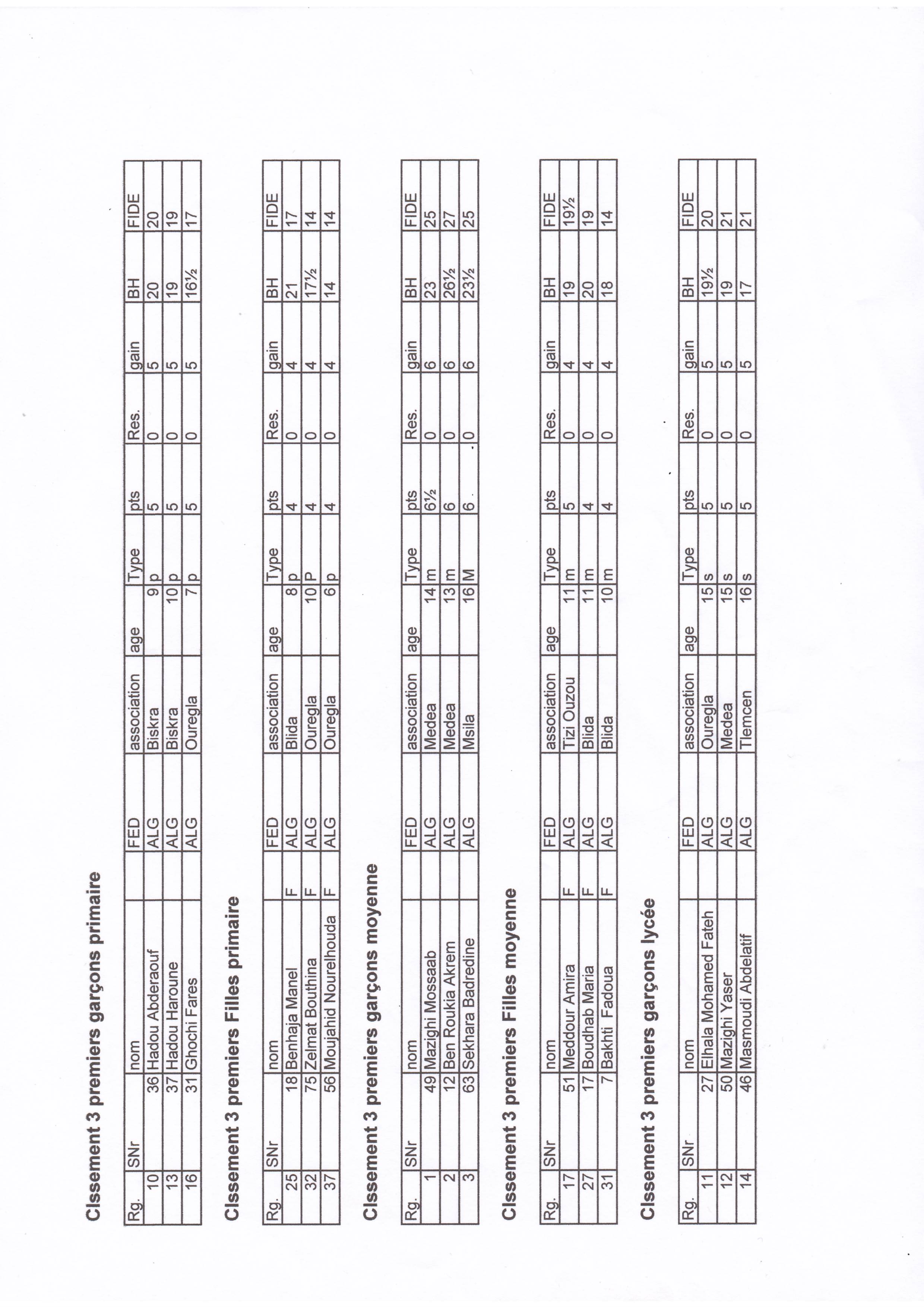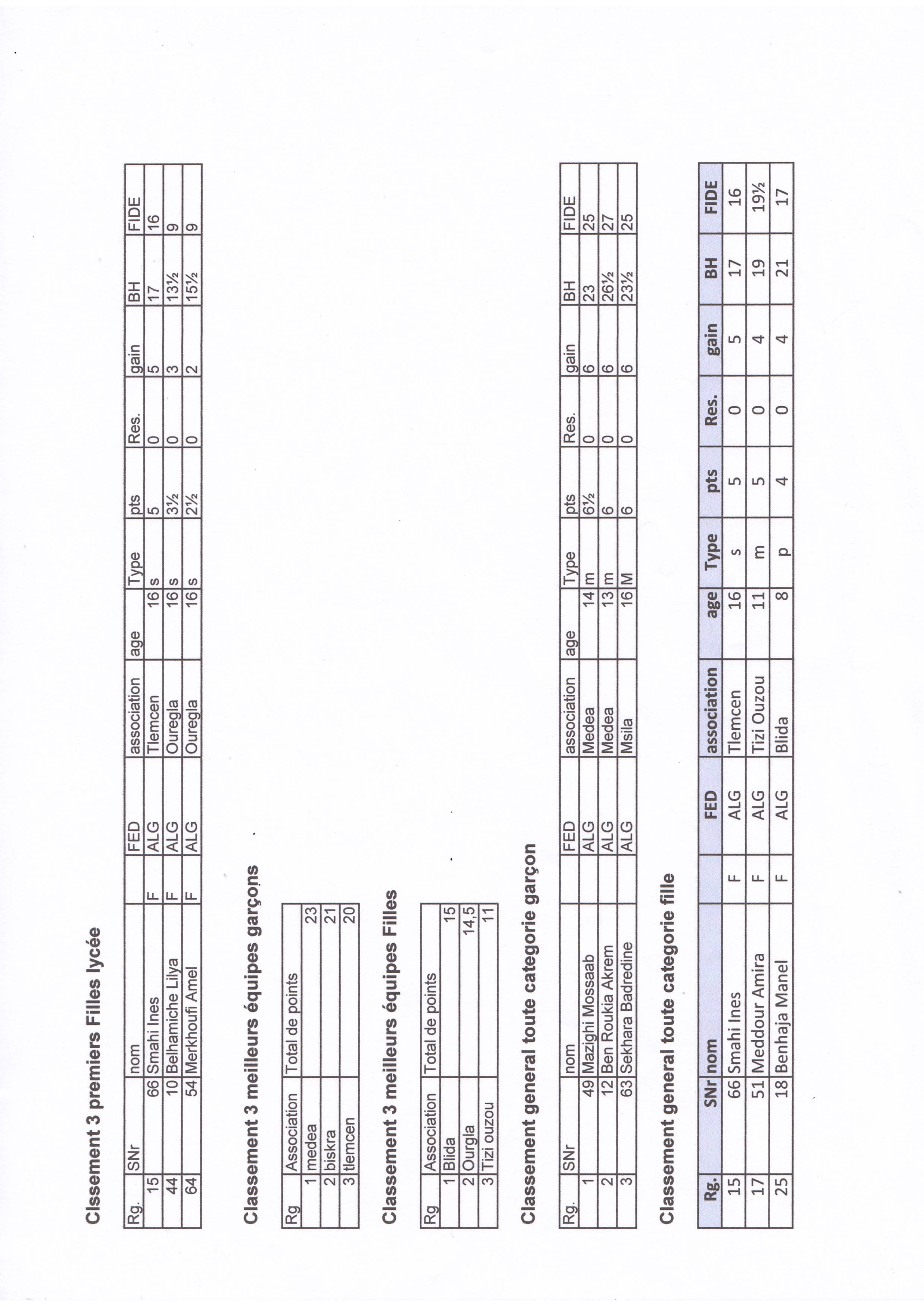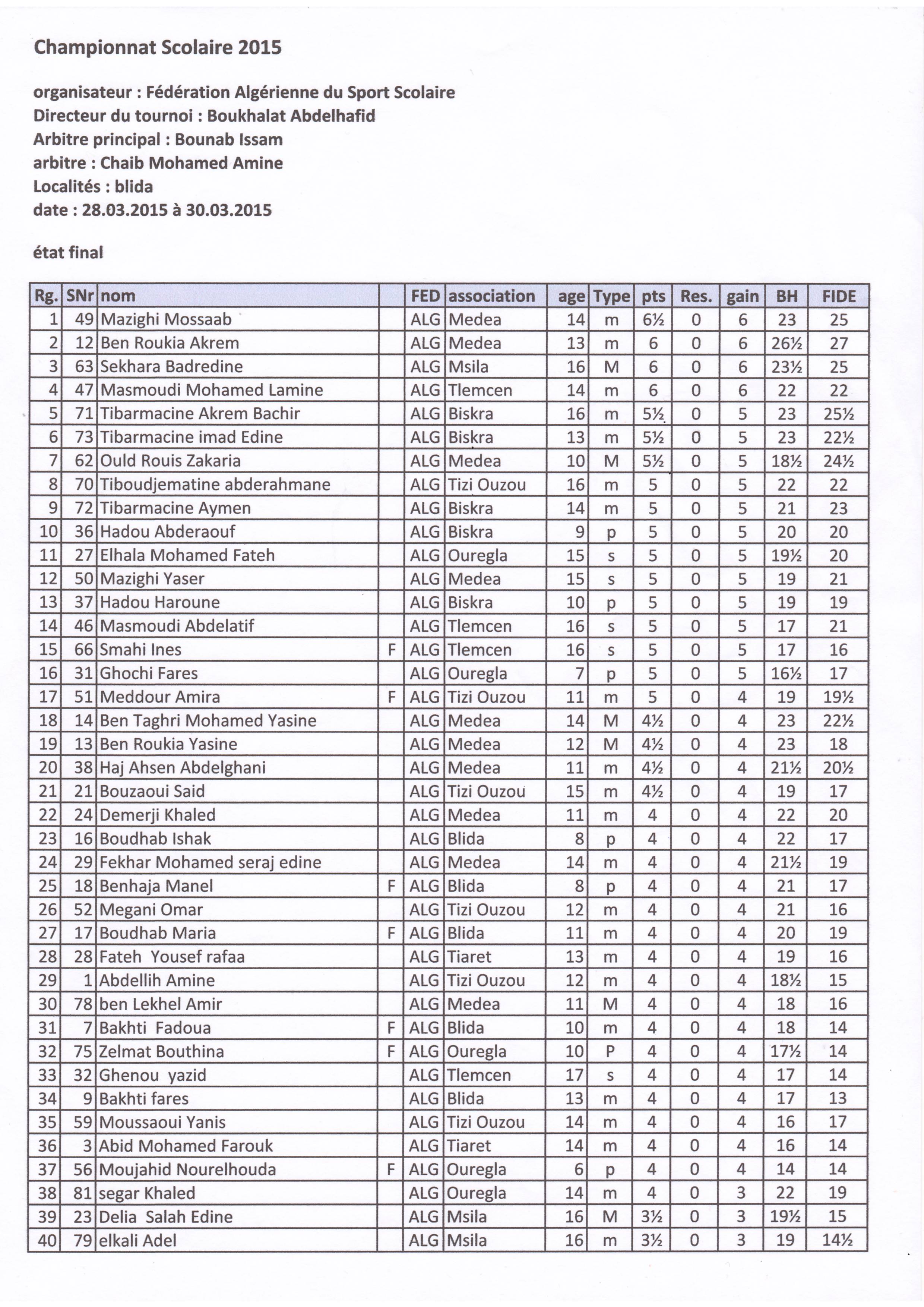 إليكم النتائج النهائية للبطولة الوطنية للشطرنج و تنس الطاولة التي أجريت بولاية البليدة حيث كل الضروف كانت مهيئة من إستقبال الوفود إلى المرافقة لمكان إجراء المنافسة حيث تم إستقبال الوفود إبتداءاً من مساء يوم الجمعية 27 مارس 2015 بالداخلية الثانوية أحمد بيطاط ببلدية أولاد يعيش أما عن مكان المنافسة فكان بالثانوية الرياضية بمدينة البليدة.