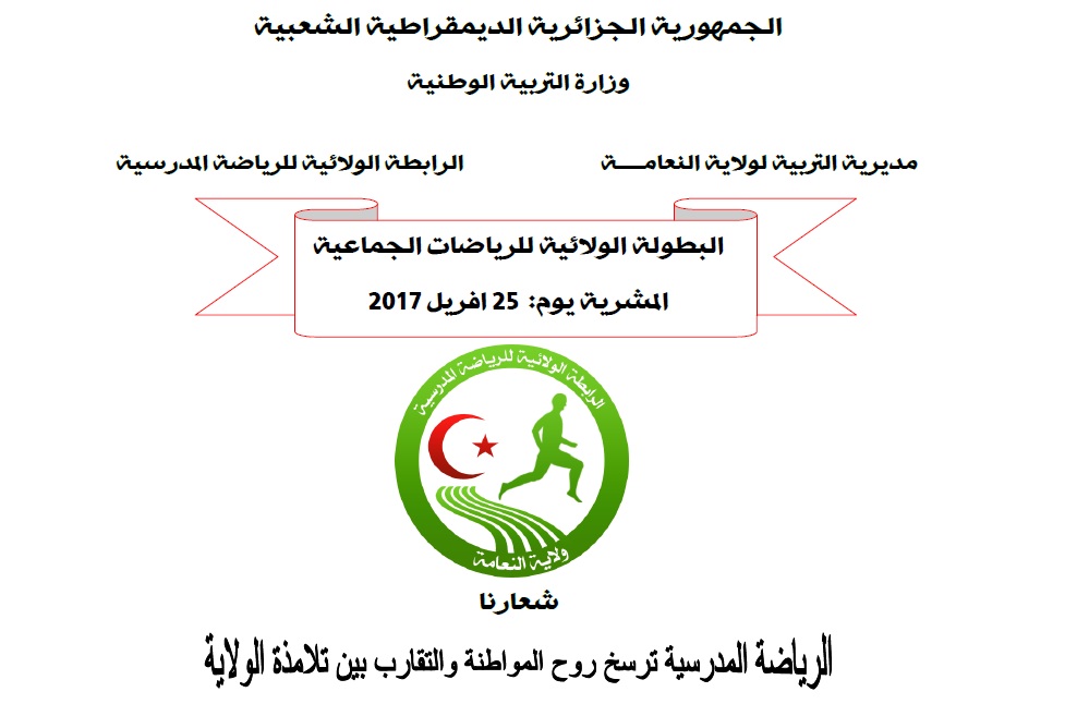 ستحتضن ولاية سطيف الألعاب الوطنية المدرسية للآمال 2016/2015، من 12 إلى 16 جويلية 2016، حيث تأهل من ولايتنا النعامة فريق كرة اليد للإناث “ناشئات” لهذه المنافسة الوطنية.
