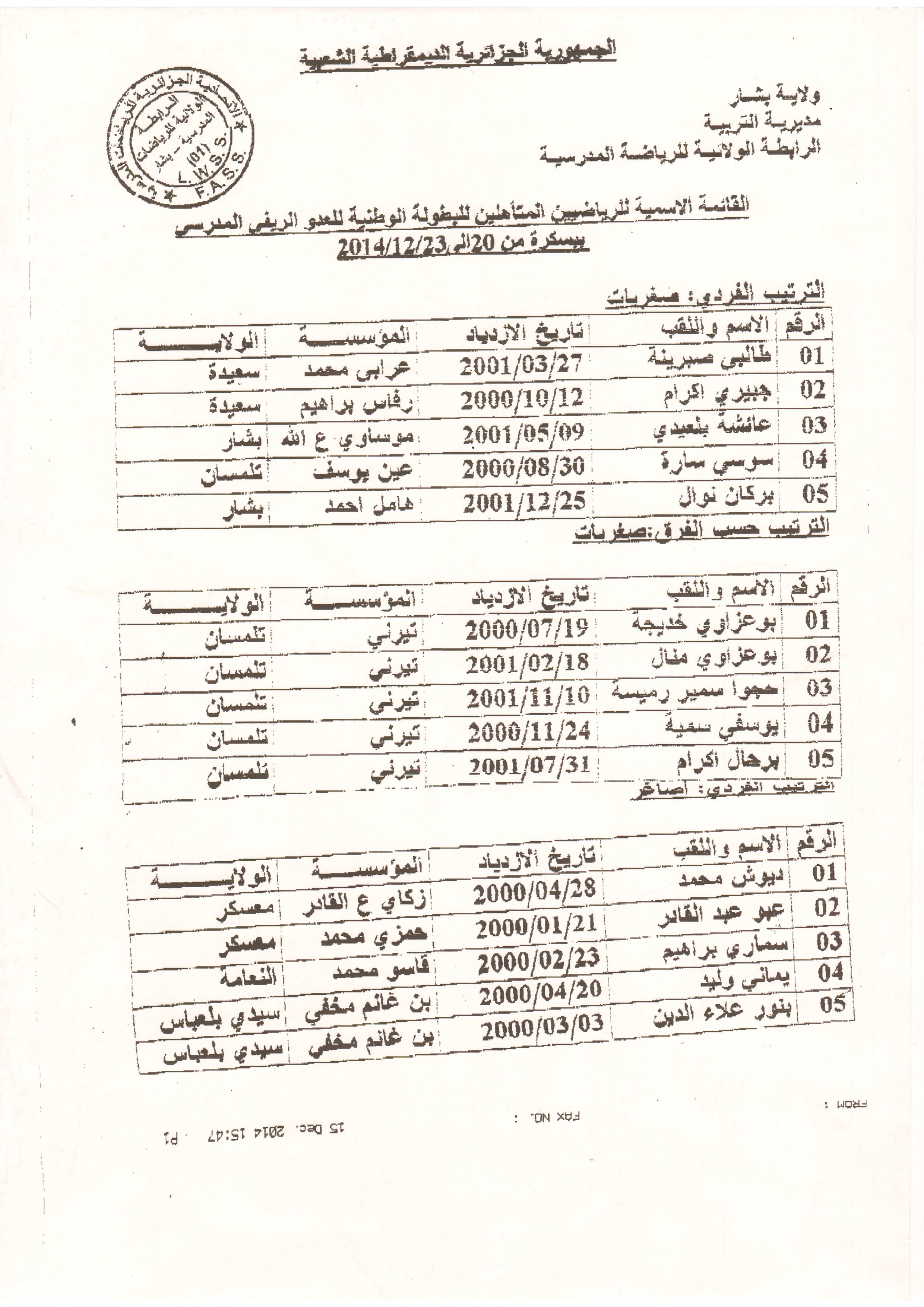 - برمجة المرحلة الولائية ما بين الجمعيات بتاريخ 2017/04/15.