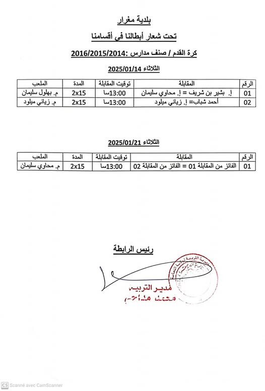 برنامج تصفيات البطولة الوطنية للرياضات الجماعية في مرحلتها البلدية – مغرار – كرة القدم