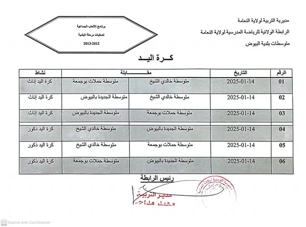 برنامج تصفيات البطولة الوطنية للرياضات الجماعية في مرحلتها البلدية – البيوض – كرة اليد – ذكور وإناث