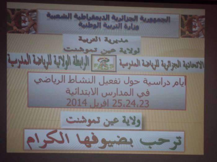 من إلقاء السيد عمور ابراهيم الأمين العام للرابطة الولائية لعين تيموشنت، موضوعها: واقع الممارسة الرياضية في الطور الابتدائي (مثال عين تيموشنت كعينة)،